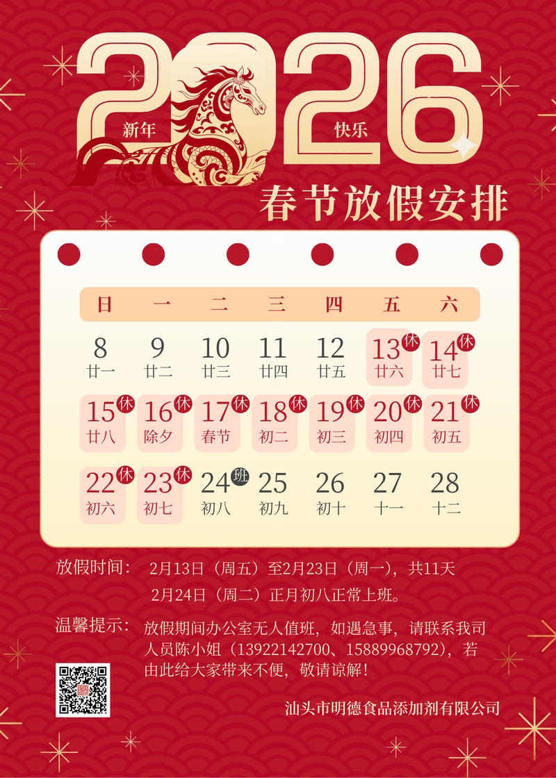 您好!新春將至,謹(jǐn)代表我司全體同仁,預(yù)祝您新春愉快、萬事順?biāo)臁?br />感謝您長期以來的支持與信任,F(xiàn)有一則關(guān)于春節(jié)物流安排的重要通知,敬請您知悉,以便提前做好生產(chǎn)安排。