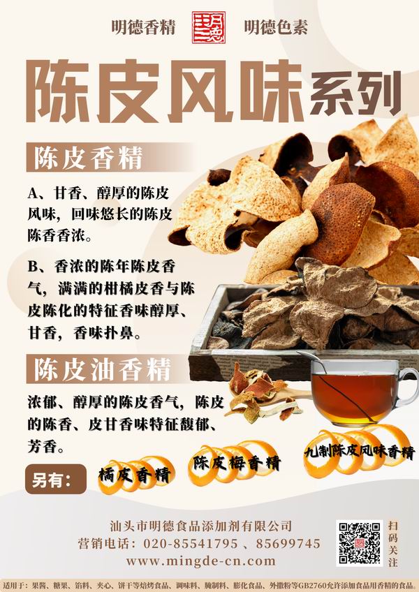 明德食品添加劑 緊跟市場潮流,應(yīng)運(yùn)而生 推出了 陳皮香精。愿使各位食品生產(chǎn)廠家朋友們更好的在新風(fēng)味浪潮中,占領(lǐng)市場先機(jī)優(yōu)勢,永立潮頭。