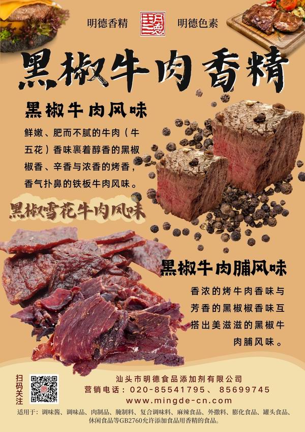 醬香、紅燒牛肉香精 肉香濃郁厚實;烤牛肉風味 烤香濃郁、脂肪香特征明顯;蒜香牛肉香精,蒜香十足,牛肉底韻濃厚;黑椒牛肉香精,椒香四溢,辛香肉香融合;鹵水牛肉香精 香味醇厚,讓人垂涎欲滴。明德 牛肉香精 香味濃郁悠長、耐溫性好(耐高溫)、適用性廣、風味醇厚。產品參數